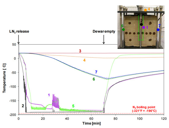 Temperature versus time during the unconfined low-pressure LN2 test. The sample picture (top right of the figure) is where the thermocouples were located on the sample (from Cha et al. [16]).