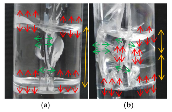 Figure 7 shows the crack morphology and tensile stress diagram, where (a) and (b) are samples 1 and 2, respectively. Two different crack morphologies were observed: the horizontal plane crack and the vertical tensile crack. The two different crack growth modes were the horizontal plane radial propagation caused by longitudinal thermal shrinkage and the vertical propagation caused by circumferential shrinkage.