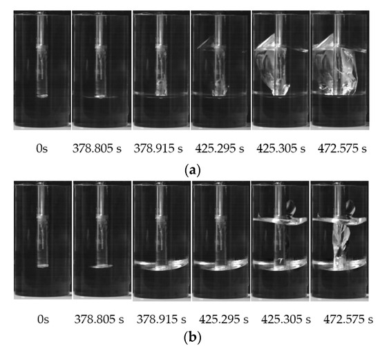 The total experimental duration of samples 1 and 2 was 25 min. During the whole release process (the first 9 min), the pressure in the hole was always in the range of 40–50 kPa (Figure 4). The drainage hose valve was fully opened, and no closure could be found in the middle.