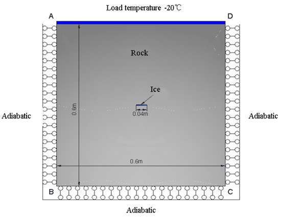 Numerical simulations are carried out using RFPA, a software that not only takes into account the non-homogeneity of a rock mass at micro and macro levels, but also captures the key behavior of rock deformation and damage [27]. Taking the numerical calculation model of the water–ice single crack of Liu et al. [28] as an example, the thermal coupling property of RFPA2D-Thermal was used to analyze the frost heaving deformation and fracture process.