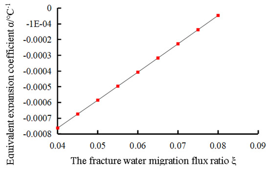 where β is the phase change volume expansion coefficient of the water–ice under free state (0.09); the crack water begins to phase change from 0 °C, that is, the phase change point Tf = 0 °C; the freezing temperature is −20 °C, so = −20 °C; = 1; and represents the proportional relationship between the water transfer flux and the original volumetric water. The curve of the equivalent thermal expansion coefficient with the water transfer flux ratio was obtained by substituting Formula (1) into the numerical value, as shown in Figure 10.