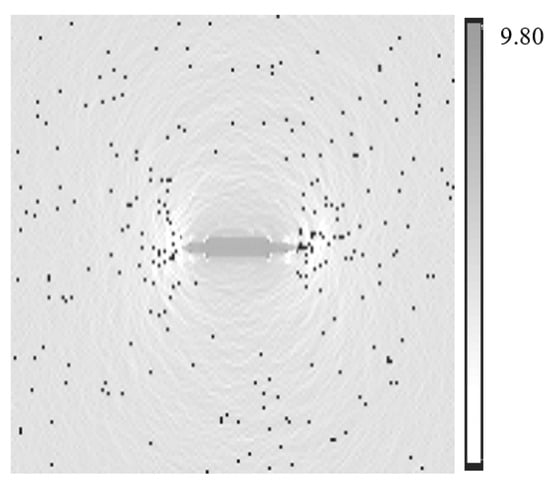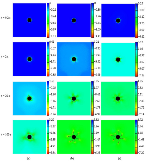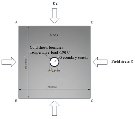 In the field test, Cha et al. [17] injected liquid nitrogen into a hole with a center diameter of 1 inch in the shale cube (8 in × 8 in × 8 in), and cracks were generated in the boundary of the hole to the rock interior under cold shock for nearly 40 min. Considering that the hole depth was much larger than its diameter, the specimen can be regarded as the plane strain state and simplified as the circular hole square plate model. The size of the model is shown in Figure 15. Quadrilateral elements were used, the number of elements was 609 × 609, and the initial temperature of the model was 20 °C. The values of the elastic modulus and Poisson’s ratio were: Es = 49.3 GPa and Vs = 0.268. Furthermore, the outer boundary of the model was not constrained, the in situ stress σ = 0, and the other parameters were the same as those in Table 2.