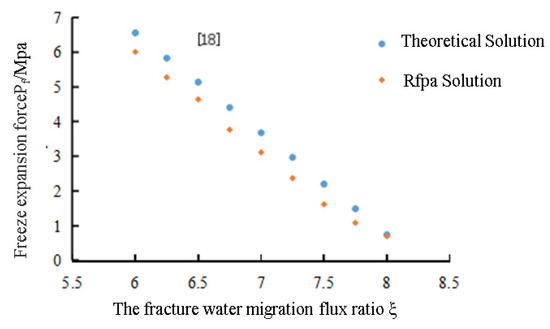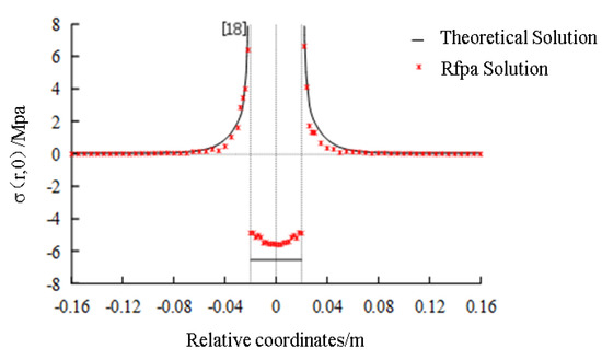 The minimum principal stress at the crack ice center was calibrated as the frost heaving force. According to the solution model deduced by Liu et al. [28], the theoretical analytical solution of the crack tip stress field under frost heaving force was compared with the numerical simulation results in this work. Figure 12 and Figure 13 demonstrate that the numerical solution obtained by RFPA2D-Thermal is in good agreement with the analytical solution, and the change trend is also in good agreement. Hence, RFPA2D-Thermal can be used to simulate the process of freezing pore water in shale by low-temperature fluid and frost heaving damage, and it can accurately predict the crack initiation.