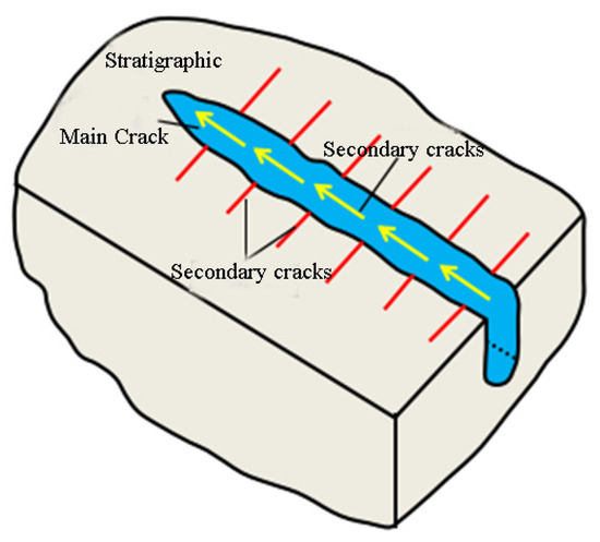 In addition to liquid nitrogen freezing damage, liquid nitrogen cold shock is also one of the main mechanisms of liquid nitrogen low-temperature fracturing. Under reservoir conditions, the heat of the rock near the contact boundary dissipates to the low-temperature fluid under the action of cold shock and quickly cools and contracts when the low-temperature fluid makes contact with the reservoir rock. Meanwhile, cracks perpendicular to the contact boundary will be formed when the tensile stress exceeds the tensile strength of the rock [16] (Figure 14).