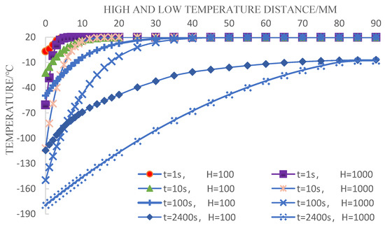 The experimental results reported by Cha et al. [16] show that the surface temperature of the borehole decreased to a lower temperature (−160–170 °C) after 10 min of a low-temperature and low-pressure injection of liquid nitrogen. After 40 min of impact, the surface temperature of the sample decreased from 20 °C to −20 °C, which is nearly 40 °C. In combination with the above discussion results and Figure 8, the heat transfer coefficient was preliminarily selected as 500 W∙m−2∙K−1. The other parameters were the same as those of the model experiment in Section 2.