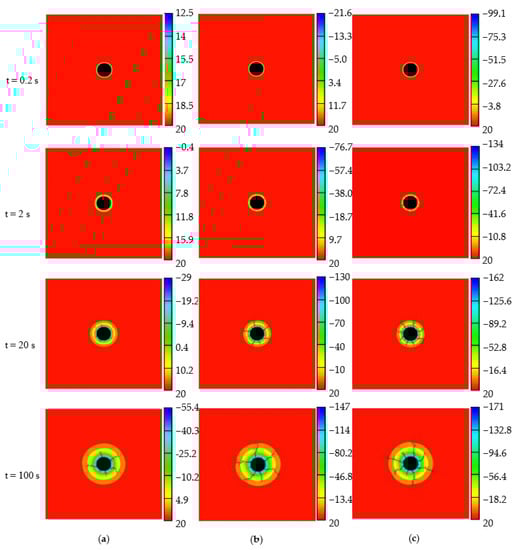 Figure 17 and Figure 18 further analyze the evolution process of the temperature and minimum principal stress with time spacing and the length of each crack scale according to the power law. Each crack kept the law of equal spacing and equal length, and its length was approximately twice that of the previous crack. The directions of the temperature gradients at both ends of the crack were also deflected. Meanwhile, Figure 17 (especially when t = 100 s) shows that the crack had a blocking and disturbing effect on the temperature field, the temperature conduction during crack initiation, and the propagation in the circular hole square model. Each row represents t = 0.2 s, T = 2 s, T = 20 s, and T = 100 s in the liquid nitrogen impact process. When t = 0.2 s, the temperature near the borehole significantly decreased. Figure 18c shows the low compressive stress inside the rock (less than 0.1 MPa) and the tensile stress around the borehole. The tensile stress caused by temperature change results in the formation of many microcracks below 1 mm at the contact boundary for the first time. The tensile stress began to increase, and its range continued to expand with the further increase in temperature gradient and temperature range. From the minimum principal stress field of t = 2 s, the tip of all initiation cracks concentrated large tensile stress and connected to each other to form a tensile stress ring, driving the initiation cracks to further internally expand. In the process from t = 2 s to T = 20 s, the contact boundary temperature further decreased to −162 °C, and the temperature range spread from 5 mm to 12 mm. The low-temperature cracks generated in the liquid nitrogen impact process radially propagated along the center of the borehole with the temperature range. However, the maximum temperature gradient gradually decreased from the contact boundary to the inner part of the rock due to the low thermal conductivity of the rock. The originally initiated microcracks (about 5 mm in length) gradually evolved into a grading phenomenon within 100 s, as shown in Figure 18c. After 20 s, three of the eight second-order cracks (about 12 mm in length) stopped expanding. The other five cracks were third-order cracks (about 25 mm in length after 100 s). The crack distance between the cracks was uneven, and the temperature field was not smooth due to the influence of the main crack propagation.
