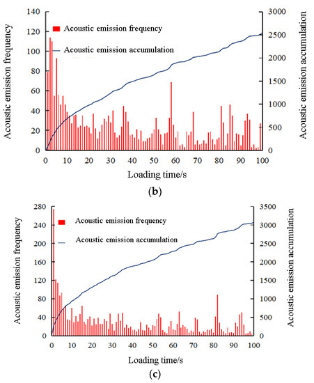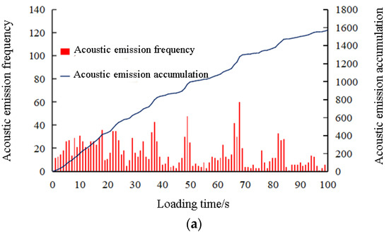 The monitoring of acoustic emissions in rock can reflect the changes in internal structure, help us to understand the time, location, and strength of microfractures, and further reveal the basic laws of rock crack initiation and propagation. Accordingly, the process is divided into various stages throughout the process of liquid nitrogen cold shock damage to the circular orifice plate model under different heat transfer coefficients, according to the changes in acoustic emission quantity and tensile stress: (1) the linear elastic deformation stage; (2) the microcrack initiation to propagation stage; (3) the instability fragmentation stage, or the stop expansion stage. Figure 11 shows the temporal variations in the number and cumulative number of acoustic emissions during liquid nitrogen cold shock, which is not described in the figure due to the rapidness of the first stage. In the second stage, the graded cracks around the wellbore are formed within 100 s. Thus, the second stage is analyzed based on 100 s.
