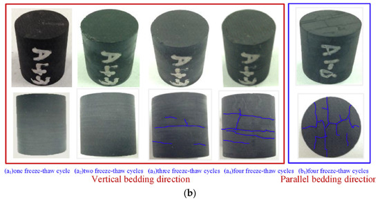 Failure patterns of shale under the condition of thermal shock by soaking the specimen in liquid nitrogen. (a) Test results of Cha [17]; (b) test results of Han [32].