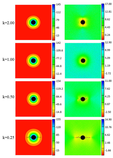Given the varying shale physical properties and in situ stress conditions, different fracture forms, including single fracture, complex fractures, and network fractures, may be formed after fracturing [33]. The in situ stress state is an important factor that affects crack initiation and propagation. Accordingly, understanding the influence of in situ stress on crack propagation and predicting and controlling the crack direction to ensure that it can communicate with natural cracks and form complex network cracks are the keys to improving the volume of fracturing. Based on the circular hole model of the horizontal well section, the in situ stress σ (x direction) is set as 6.89 MPa (1000 psi) to study the influence of temperature stress distribution and crack propagation under the liquid nitrogen impact of the circular hole model with different lateral stress coefficients k (k = 0.25, 0.5, 1, 2).