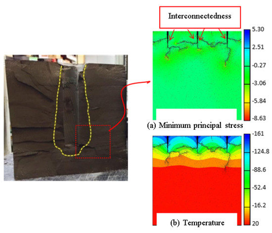 After 40 min of liquid nitrogen cold impact, the length of the main crack generated under the condition of K = 2 was about 13 mm [17], similar to the length of the crack after 40 min in Figure 9a, indicating the feasibility of the numerical simulation software to simulate the low-temperature fracturing process of liquid nitrogen.