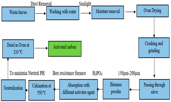 The leftover leaves of “Lantana camara” and “Olive trees” (6 g) were collected. To eliminate dust from the leaves’ surfaces, they are rinsed three times with distilled water (500 mL). To eliminate moisture from the leaves, they were kept in the open air for 3 to 4 days in the presence of sunlight before being crushed. The dried leaves were crushed and sieved to a depth of 250 µm. After that, the fine biomass powder (4.345 g) was activated in a H3PO4 (wt 50%) solution. The H3PO4 solution’s initial concentration and density were 85% and 1.685 g/mL, respectively. For a (1:1) impregnation ratio (the impregnation ratio was determined as the ratio of the weight of H3PO4 to the weight of the dried biomass from olive trees and Lantana camara) the needed H3PO4 volumes per (4.345-g) dry raw material were 3.03 mL []. The phosphoric acid activating agent took 24 h to absorb. H3PO4 acts as an activator, causing the number of defects to rise []. The slurry-based material was calcined for 2 h at 550 °C in a box resistance furnace. The excess H3PO4 was rinsed out of the char with distilled water until it reached a neutral pH. After that, it was dried in a 105 °C oven for 1 h to get a 4-g activated carbon []. Figure 1 shows the steps involved in the preparation of activated carbon.