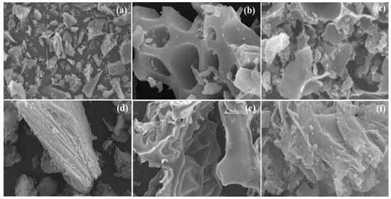 SEM micrographs of activated carbon olive trees (a–c) and Lantana camara (d–f).