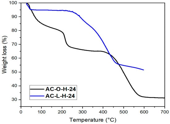 Figure 4 shows the thermal stability of activated carbon at all ranges of temeperature. At a temperature range of 110–250 °C, the presence of free water molecules in the interlayer region was evaporated, resulting in the removal of physically adsorbed water from the produced samples. TGA analysis of activated carbon produced initially showed that phosphoric acid had been transformed into an anhydrous material. At 213 °C, the two-step process begins, phosphoric acid self-polymerizing into pyrophosphate. The dehydration process was completed at 200–300 °C, and the degradation and pyrolysis process as an oxidant with hemicellulose, cellulose, and lignin structure to produce the pore structure in the activated carbon was completed at 350–400 °C []. Finally, full thermal deterioration begins due to the coagulation process. In case of olive tree thermal degradation, more than 50% weight is lost at approximately 450 °C and almost fully degrades at 575 °C. In the case of Lantana camara activated carbon, thermal degradation starts at 270 °C and full degradation occurs at above 450 °C.