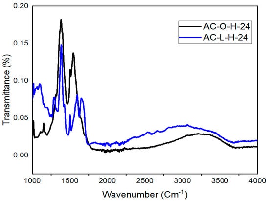 Figure 5 shows the surface functional groups of the produced AC as determined by FT-IR. FT-IR analysis reveals that oxidation forms and provides information on chemical bonding and breakdown. According to the FT-IR results of H3PO4-based AC, the bonds at wavenumbers of 1000–1100 cm−1 were attributed to C–O vibrations. The elemental analysis results correspond with the presence of oxygen and phosphorus functionalities (P–O–C) in the wavenumber range of 1000–1200 cm−1. The bond at 1565 cm−1 was also linked to C=C vibration [,].
