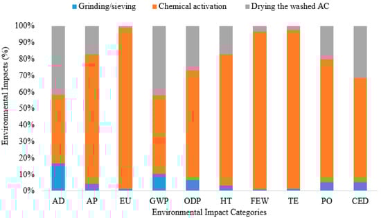 By analyzing the production of AC, only the steps of grinding and sieving, chemical activation, and drying of the AC final product are considered. The results, shown in Table 5, demonstrate that three processes were responsible for the majority of the impact: chemical activation of raw material by utilizing H3PO4, followed by drying the washed AC, and finally the grinding and sieving step. The respective impact contributions of the three key AC production phases selected in the categories evaluated are shown in Figure 6. In terms of most of the impacts considered in this study, the chemical activation step had the biggest ecological impact. The following is the ascending order of the impacts, the ozone layer depletion potential (42.27%), the acidification potential (55.31%), human toxicity (57.00%), freshwater aquatic ecotoxicity (85.01%), terrestrial ecotoxicity (86.17%), and eutrophication (92.20%). The usage of H3PO4 was the largest contributor, particularly for human toxicity and acidification potential impacts; phosphoric acid contributed 90% and 90%, respectively, to these impacts. The category of abiotic depletion involves three steps of grinding/sieving, chemical activation, and drying with percentages of 10.20%, 25.15%, and 25.32%, respectively.