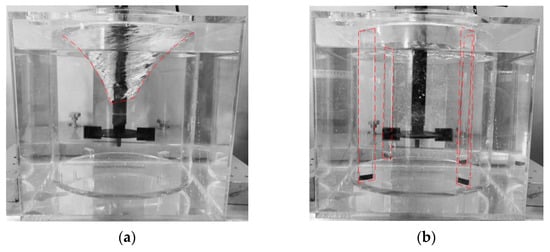 The full baffle flat-bottomed cylindrical vessel was experimentally investigated, and the dimensions are shown in Table 1. A cylindrical stirred tank was placed in a square water tank to reduce the effect of light refraction at the cylindrical surface on the experiment. The impeller and shaft were black painted, to prevent the high-speed camera (CCD) from being damaged by strong laser reflection (Figure 4b).