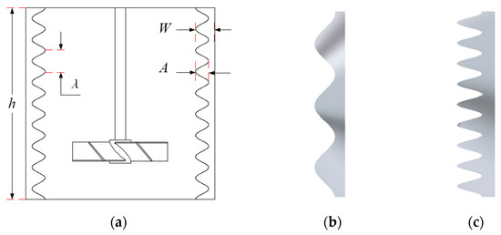 A schematic diagram of the stirring device with sine baffles. (a) Agigator, (b) A/W = 0.333, λ/h = 0.104, and (c) A/W = 0.333, λ/h = 0.028.