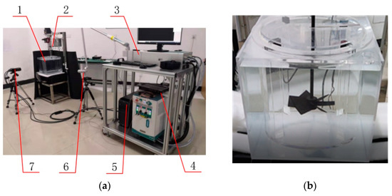 Experimental device. 1—stirring device, 2—electromagnetic phase locking device, 3—laser, 4—synchronizer, 5—computer, 6—cylindrical, and 7—CCD camera. (a) PIV device; (b) stirred tank.