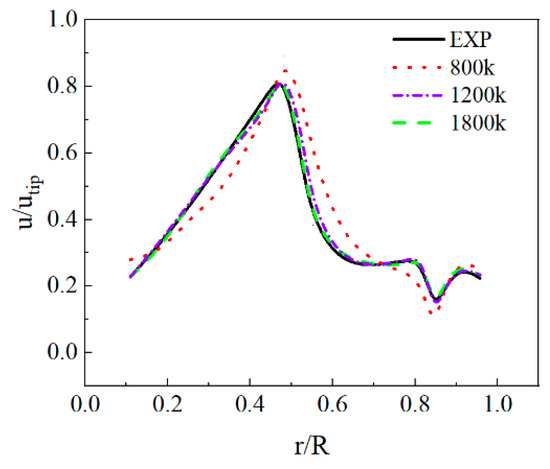 The sliding grid (SG) algorithm was applied to the simulation of the impeller rotation with the set time step and the time-step stop criterion of 0.005 s and 10−4, respectively, and the Courant number was restricted less than 1. As far as the SG simulations were concerned, 50 s was enough to satisfy the stable flow field conditions. To model the near wall regions, the standard wall function was used. The logarithmic law for the mean velocity is known to be valid for 30 < y+ < 300. The y+ values calculated in this study were within this range. All geometry walls were assumed to be the no slip boundary conditions, except that the top surface adopts free slip condition to simulate the free surface. Under the initial conditions, the solid particles were settled uniformly at the bottom of the tank, while the liquid was kept stationary in the remaining space of the tank. The mesh of the impeller and baffle was refined to capture better flow field details [14], and the independence of the mesh was verified. If the number of grid cells was too small, the precision of the numerical simulation results would be low, and there would be a large deviation from the experimental results. At the same time, if the number of grid cells was too large, not only would there be little improvement in the calculation accuracy, the calculation cost would also be increased. The specifications of the standard baffle agitated tank experimental device used in the present study were consistent with those in a previous study [18], and the grid independence verification results were referred to. When the number of grid cells was 800 k, the average velocity exhibited a similar trend as the experiment, but the agreement was lower. When the number of grid cells was between 1200 k and 1800 k, the calculation requirements and accuracy could be met (Figure 5). Since the research object of this paper was the baffle, it was necessary to refine the mesh at the baffle. The number of grid cells of the sinusoidal sawtooth baffle stirred tank was selected from 2200 k to 2800 k.