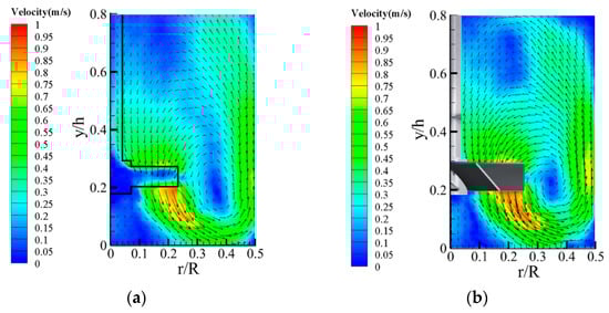 A velocity comparison (y/h = 0.25) in the annular flow area (r/R = 0.6~0.9) between the impeller and the baffle. (a) The radial velocity; (b) the tangential velocity.
