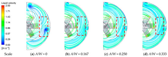 The velocity streamline distribution (y/h = 0.25) of the baffle with different relative tooth heights (A/W) when λ/h = 0.104.
