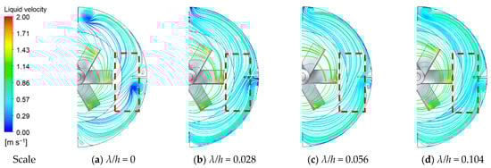 The velocity streamline distribution (y/h = 0.25) of the baffle with different relative tooth widths (λ/h) when A/W = 0.333.