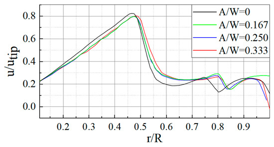 A comparison of the average velocity along the radial direction (y/h = 0.25) of the baffle with different relative tooth heights (A/W) when λ/h = 0.104.