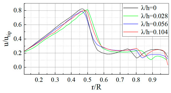 A comparison of the average velocity along the radial direction (y/h = 0.25) of the baffle with different relative tooth widths (λ/h) when A/W = 0.333.