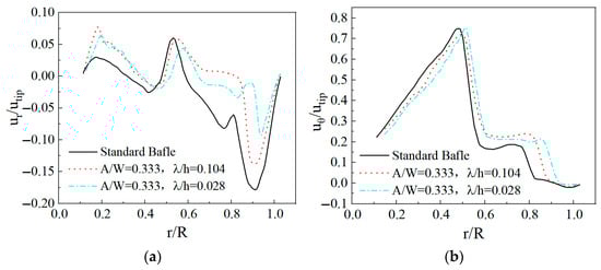 Figure 11 depicts the radial and tangential velocity distributions of the fluid on the impeller plane. The negative value in Figure 11a can be attributed to the fluid being unable to pass directly through the baffle area for the obstruction of the baffle; thus, a vector was pointing to the axis. The notch on the edge of the sawtooth baffle allowed part of the fluid to pass through the notch to merge with the fluid bypassing the baffle, which weakened the baffle’s blocking effect on the fluid and reduced the fluid flow resistance; thus, the negative value of the radial velocity was small. The change of radial velocity enhanced the annular motion of the fluid. In the annular flow domain between the blade and the baffle (r/R = 0.6~0.9), the tangential velocity of the sinusoidal sawtooth baffle was significantly higher than that of the standard baffle.
