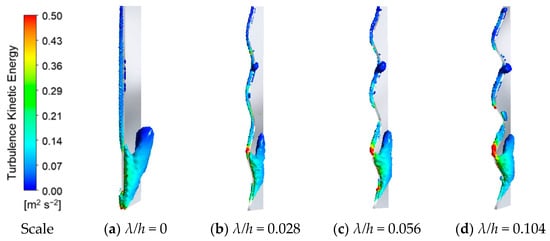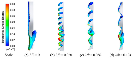 The effect of turbulent kinetic energy on the 3D vortex structure behind the baffle at different tooth heights when λ/h = 0.104.