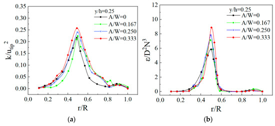 The effect of relative tooth width on local radial turbulence dynamics (A/W = 0.333). (a) The turbulent kinetic energy; (b) the turbulent dissipation rate.
