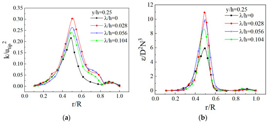 The effect of relative tooth height on local radial turbulence dynamics (λ/h = 0.104). (a) The turbulent kinetic energy; (b) the turbulent dissipation rate.