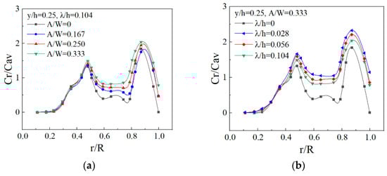 The particle concentration distribution in the radial direction. (a) The effect of relative tooth height (A/W); (b) the effect of relative tooth width (λ/h).