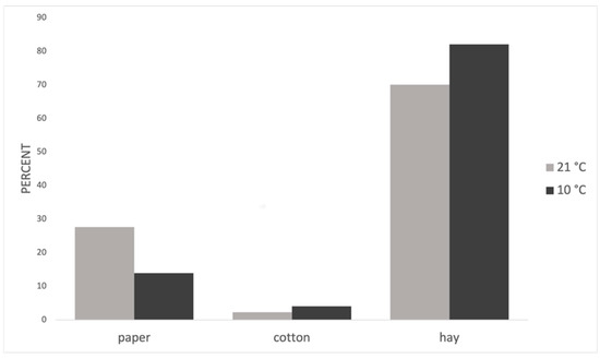 At 10 °C, the probability of choosing hay for nests increased and that of paper decreased, while the use of cotton also increased (Table 3, Figure 2).