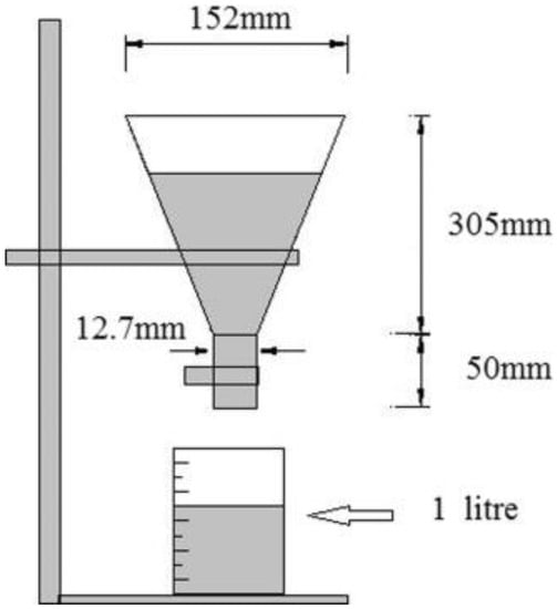 The fresh state properties of foam concrete are evaluated in terms of two factors; consistency and stability. Using Marsh cone and flow cone diffusion tests, the flow times of foam concrete are obtained, so the consistency of the foam concrete can be evaluated []. When the flow time value of foam concrete is below 20 s and the flow value is between 40% and 60%, it was found that it is good in terms of consistency []. In the study using modified marsh cone (Figure 1), the behavior of the foam concrete according to the flow time is classified as given in Table 5.