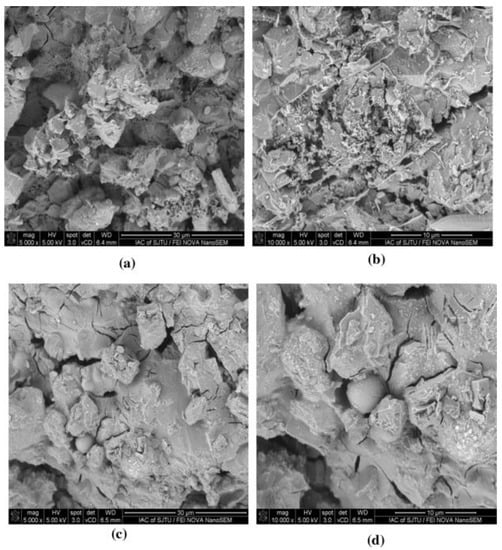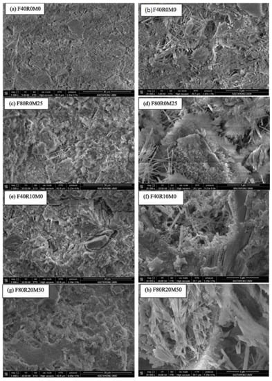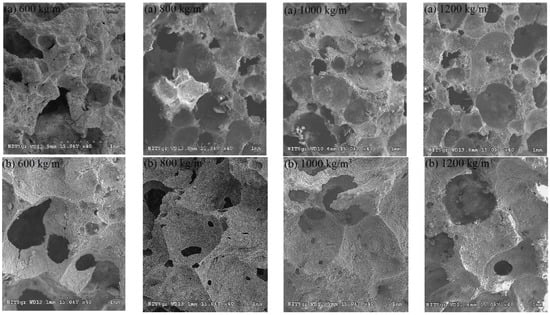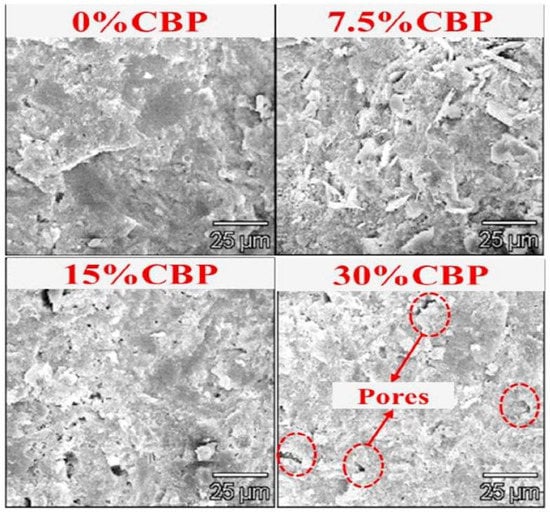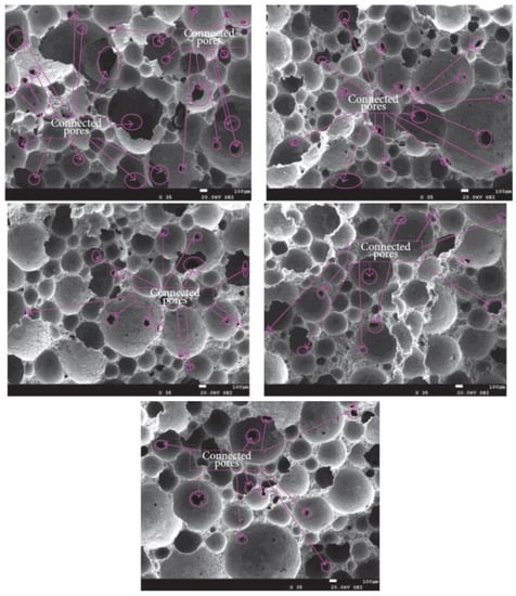 The strength and durability properties of cement-based materials are affected by the porosity, permeability, pore size and distribution of the material []. If we consider the pore structure of foam concrete in general, it has three types of porosity: gel pores, capillary pores and air pores []. While capillary and air pores affect the strength properties of foam concrete, gel pores have no effect on the strength []. The pore distribution and size of the foam concrete directly affect its mechanical and physical properties. Therefore, the properties of the porous structure are very important for foamed concrete []. The SEM images in Figure 2 can be shown as an example of the pore structure formed by the addition of foam [].