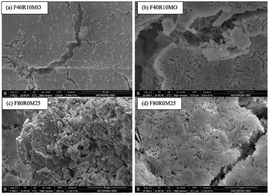 In the study conducted by Ma and Chen [], the thermal conductivity of foam concrete prepared using 10% fly ash and MPC increased the compressive strength and thermal conductivity by 25% and 9.1%, respectively, compared to those without fly ash. The reason for this can be shown as the participation of fly ash in the hydration mechanism and improving the pore structure. However, with the increase in the amount of fly ash, a decrease in the compressive strength occurred. This situation may be due to the decrease in the amount of cement. In the study, the effect of silica fume was also investigated, and it was reported that silica fume reduced the compressive strength and thermal conductivity. As reported in the literature, silica fume may decrease the mechanical properties of the MPC mortar because amorphous silica of SF (silicon dioxide) does not contribute to the hydration products of MPC []. In this manner, the reason also can be that the decrease in the MAP (MgNH4PO4·6H2O) (hydration product of MPC) amount causes a decrease in the compressive strength [].