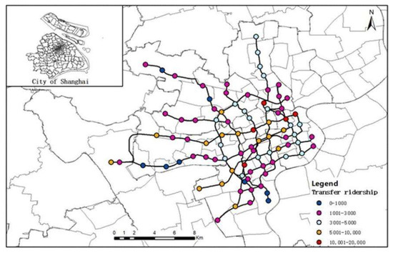 The data of this study came from the IC card data of bus–metro transfer, at 88 metro stations along 12 metro lines in Shanghai. According to the bus–metro-transfer data of the metro IC card of Shanghai Shentong Metro Group Co., Ltd. (Shanghai, China), on 1 September 2016, there were 685,351 preferential records of bus–metro transfer, at all stations of the Shanghai metro network. By filtering the station information, missing data and abnormal data were deleted. Finally, we obtained 275,919 valid pieces of data, from 88 metro stations in the study area.