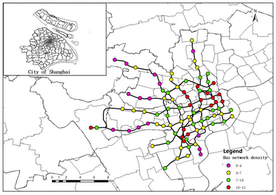 With the rapid development of global megacities, sustainable development has, gradually, become a basic requirement of urban planning and governance [71]. The relevant research and discussions on urban optimization have attracted the attention of a great number of researchers [72,73,74,75]. Facing various traffic-congestion problems caused by urban expansion [76,77], the Shanghai government has taken actions to improve the coordinated transportation efficiency of bus–metro-transfer hubs, which is one of the key steps to accelerating the maturity of the public transport network covering the whole city. Based on some studies related to Shanghai metros, this paper selects the 88 metro stations located next to the metro lines, in Shanghai [78,79]. The metro-station areas selected in this study include both composite functional areas and single-residential functional areas.