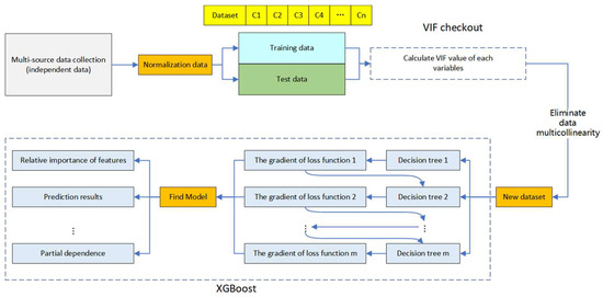 After solving the multicollinearity problem of multi-source data, the new dataset is substituted into the XGBoost model, for further prediction and analysis. The overall model framework of this paper is shown in Figure 3.