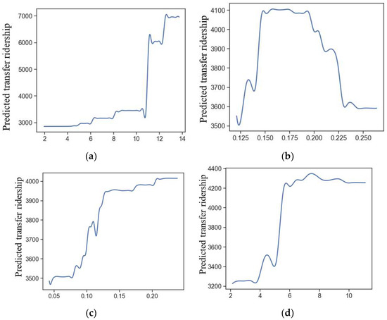 Figure 4 describes the nonlinear influence of the four independent variables of the bus–metro connection characteristics on transfer ridership. Figure 4a shows the positive association between bus-network density and bus–metro-transfer ridership. When the bus-network density around metro stations is 4 km to 11 km per square kilometer, the transfer ridership shows a slow upward trend. When the bus-network density is 11 km to 13 km per square kilometer, the transfer ridership increases rapidly. However, the transfer ridership decreases slightly between 11 km and 12.5 km. When it rises to about 7000, the transfer ridership tends to be stable, after a period of time. The result implies that increasing the bus-network density helps increase the transfer ridership. It, however, has little effect on attracting transfer ridership, when the bus-network density increases to a threshold of 12.8 km per square kilometer.