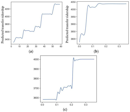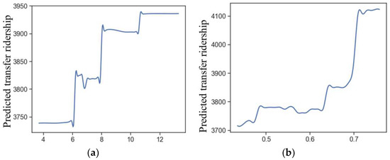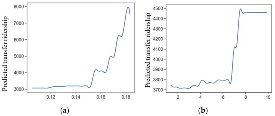 Figure 4b shows the significant nonlinear relationship between the average transfer distance and bus–metro-transfer ridership. Transfer ridership presents a higher value, when the average transfer distance is between 0.15 km and 0.18 km. This implies that the transfer distance within the range has a high attraction for travelers, to travel with the bus–metro combination. When the average transfer distance exceeds 0.18 km, the transfer distance has a negative impact on the transfer ridership, indicating that too large a transfer distance will reduce the transfer intention of passengers. Similarly, a study [35] explored that the less transfer walking time and waiting time there is, the higher the probability of people choosing combined travel. Research [92] obtained the conclusion that it was better to build new metro stations within 0.55 km, around existing bus stations, and within 0.25 km, of new bus stations, around the existing metro stations.