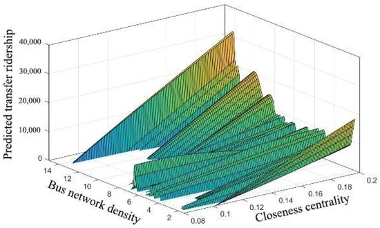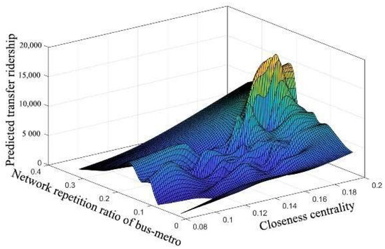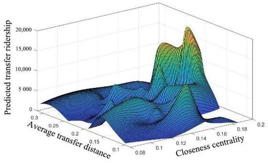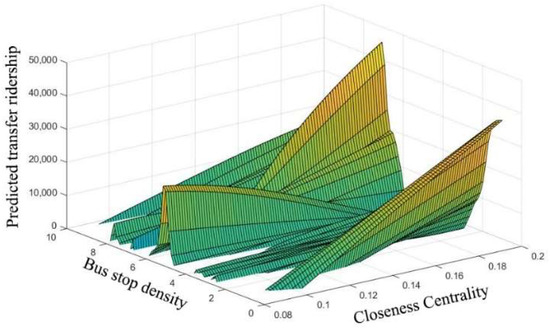 Figure 5 depicts the marginal impact of network attributes, based on metro stations on transfer ridership. Figure 5a suggests that closeness centrality has a positive influence on the bus–metro-transfer ridership. When closeness centrality is less than 0.15, there is almost no change in transfer ridership. By contrast, when closeness centrality increases from 0.15 to 0.18, transfer ridership increases, by about 5000 passengers. Once it is above 0.18, the corresponding transfer ridership slightly decreases. This result is reasonable. The stations of closeness centrality of more than 0.18 are central stations. These central stations are the travel destination of most passengers. In other words, only within a certain interval of closeness centrality does it have a significant impact on bus–metro-transfer ridership. In comparison with traditional studies on bus–metro-transfer ridership, this result is not fully explored.