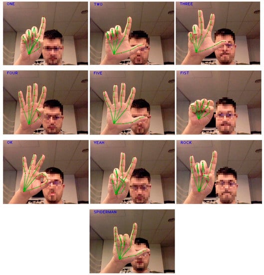 We implemented the following gestures: ONE, TWO, THREE, FOUR, FIVE, FIST, YEAH, ROCK, SPIDERMAN, and OK, as shown in Figure 1. Each of the gestures is defined by a finger state. The full list of gestures is presented in the following section.