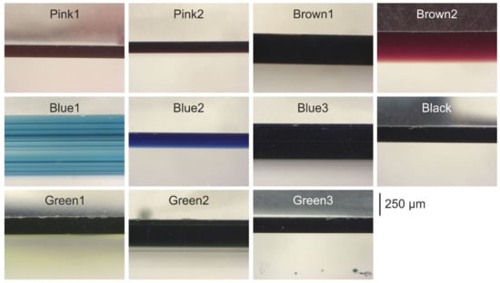 The study was conducted in a set of 11 flashed glasses, provided by LambertsGlas®, consisting of a colorless base glass covered by layers of different colors and thicknesses (Figure 1).