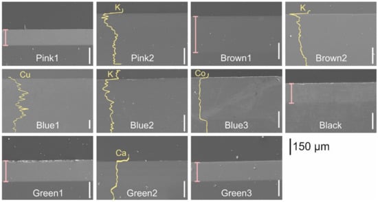 In the samples with a clear layer, FESEM-EDS thickness measurements were comparable to those quantified by OM (Table 1); however, when this layer was not observable, the thickness was estimated through FESEM-EDS linear analyses by determining the profile of the chemical concentration of different elements (Figure 3). In the Pink2, Brown2, Blue2, and Blue3 samples, it was observed that the surface layer has a higher concentration of potassium or cobalt than the base glass; however, the thickness of the surface layer on the Green2 sample was estimated using calcium element, which presents a lower concentration in the colored layer in comparison with the base glass (Figure 3). The thickness was estimated as a range between the following two values: the depth at which the composition of the colored layer loses its homogeneity and the depth when the homogeneous material of the base glass appears. In this range, the chemical composition varies as a result of the ion exchange produced between the two glasses during manufacturing. This measurement method is not as accurate as that provided by OM, although the values obtained by the two methods are in good agreement (Table 1). Green2 was the only sample in which the thickness measurements did not match because OM revealed the presence of some colored lines in the bottom of the colored layer that was too thin to be detected by EDS linear analysis.