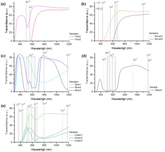 Transmittance spectra of the different colored flashed glasses: (a) pink, (b) brown, (c) blue, (d) black, and (e) green.