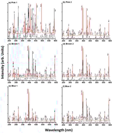 The LIB spectra from flashed glasses, displayed in Figure 5 were recorded on colorless base glass (lower black spectra) and on their corresponding colored layers (upper red spectra). The assignment of the spectral lines was based on the NIST database []. Table 3 summarizes the main elemental components of the base glasses and of the corresponding-colored layers of the considered samples, determined by the assignment of the spectral emission lines.