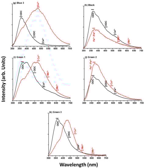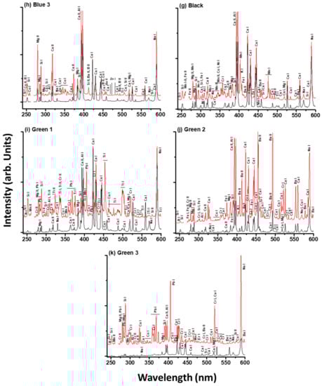 LIB spectra of Green1, Green2, and Green3 samples are shown in Figure 5i–k. The different shades of green color of these samples (from light green for Green1 to dark green for Green3) are due to quantitative differences in the main chromophores, Cr and Cu for Green1, Fe, Cr, and Cu for Green2, and Cr, Cu, and Co for Green3.