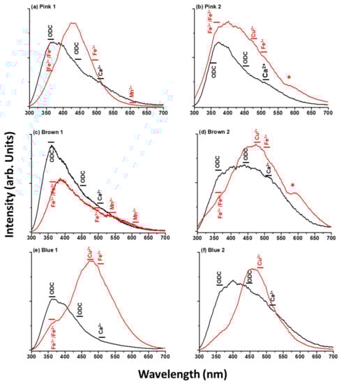 The LIF spectra of colored layers (red lines in Figure 6) display some specific features in addition to those observed in the base glass. As already indicated and revealed by FESEM-EDS, UV-Vis-IR spectroscopy, and LIBS, chromophores based on Fe, Cu, Mn, Co, Ni, and Cr account for the different colorations. The contribution of these chromophores to fluorescence emissions of the colored layers is not much evident in the LIF spectra of the samples due to the expected reabsorption of the fluorescence from these compounds with absorption bands in the near-UV and visible spectral ranges. Despite this, the weak shoulders over-imposed on the main emission band and observed at 360, 475, 500, 540, and 610 nm have been tentatively attributed to the presence of Fe3+/Fe2+, Cu2+, Fe3+, Mn2+, and Mn3+, respectively [,]. On the other hand, the prominent bands observed around 580 nm, specifically for the dark-colored layers from the samples Pink2 and Brown2, may be assigned to emissions from copper nanoparticles [].